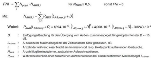 [4] Auch die dem Nachtindex zugrundeliegenden Annahmen sind wissenschaftlich untermauert: Sie gehen auf die Studie „Wirkungen nächtlichen Fluglärms“ des Deutschen Zentrums für Luft- und Raumfahrt (DLR) aus dem Jahr 2006 zurück. Die Berechnung erfolgt anhand einer komplexen mathematischen Formel, die die Anzahl und die Lautstärke der in den Nachtstunden stattfindenden Einzelschallereignisse mit deren Wirkungen auf den Schlaf des Menschen in Beziehung setzt (siehe Kasten auf dieser Seite).